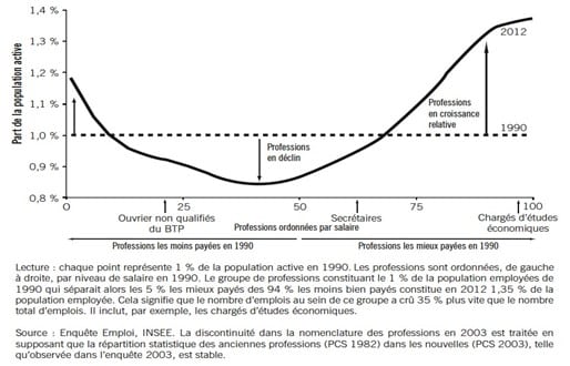 Dans une note pour l’Institut Montaigne, Sylvain Catherine, David Thesmar et Augustin Landier[13] ont analysé la polarisation du marché du travail en France depuis 1992. Ils confirment que de 1992 à 2012, les emplois qui ont été créés se situent aux deux pôles de l’échelle des salaires, tandis que les emplois du milieu (milieu inférieur) déclinaient. Nous reproduisons ici leur graphique représentant ces tendances :